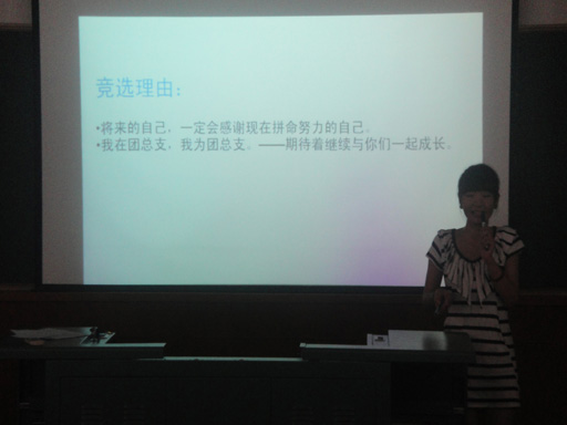 最后,张莉莉副书记发表讲话,对今晚的宣讲进行了精辟总结,大会获得圆满成功。此次竞选不仅是对团总支的领导人更新换代,也是团总支对于过去一年工作的总结和反思,总结经验,找出不足,弥补不足,希望成功当选的同学与团总支所有成员再接再厉,创造出英语系团总支更美好的一个未来。