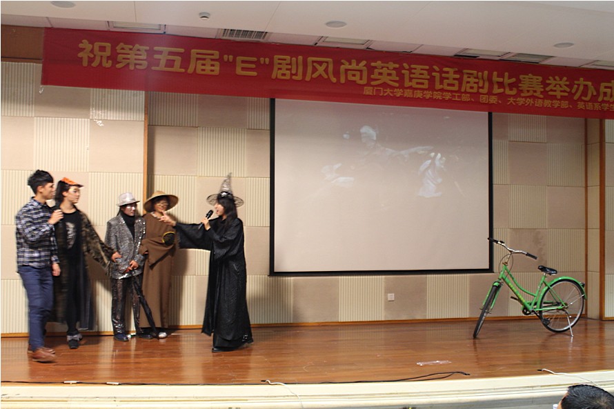 2012年12月18日晚7点,在厦门大学嘉庚学院主楼群三号楼小报告厅,第五届“E”剧风尚英文话剧决赛精彩上演。出席本次比赛的评委、嘉宾有英语系执行主任杨昆老师,外教Stephen ling、Karen li,以及大外部辜莹莹、梅家象老师等。