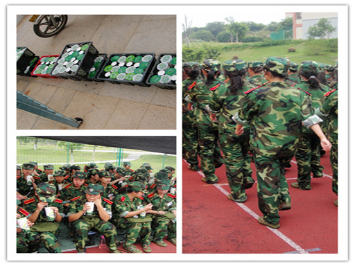各干部将水搬运到新生训练场地附近,等待着辛苦训练的11级同学们休息时间的到来。当哨声吹响各排带回到休息场地时,学弟学妹们已经十分疲惫,但是看到了慰问队伍的到来感到了阵阵温暖。
