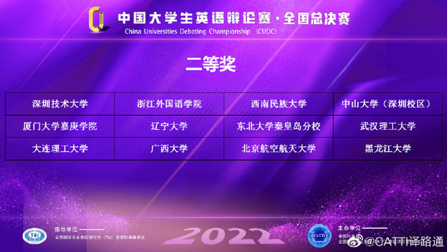我校英语辩论队推选吴俊铠、徐婷娟同学参加11月的华南地区赛,这两位同学不负众望,在华南赛区中脱颖而出,顺利晋级全国总决赛。经过激烈角逐,全国128所高校获得2022CUDC全国决赛参赛资格,我校学子获得全国二等奖。